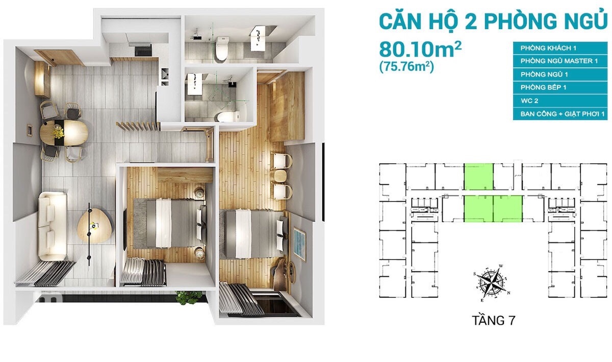 - Căn 02 phòng ngủ có diện tích từ 65.51-80.1m2 giá từ 3,7 – 4,2 tỷ/căn.